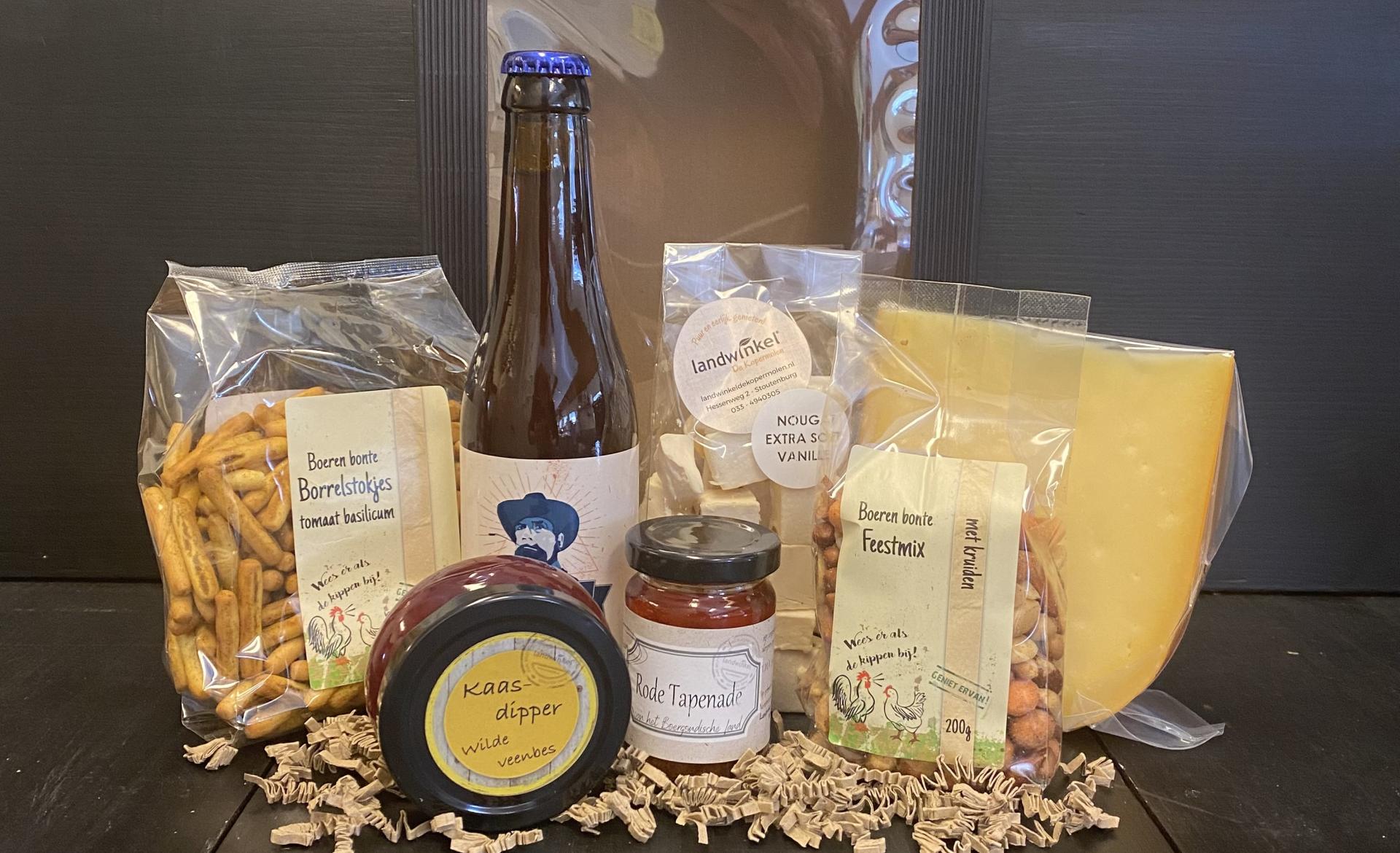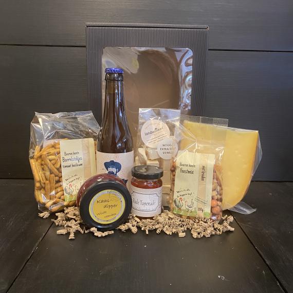 Boer Bart geniet van zijn Achterveldse biertje! Samen met een stuk echte boerenkaas, dipsticks met tapenade en nootjes beleeft hij een paar gezellige uurtjes. In deze box zitten heerlijke delicatessen waar iedereen dol op is!
