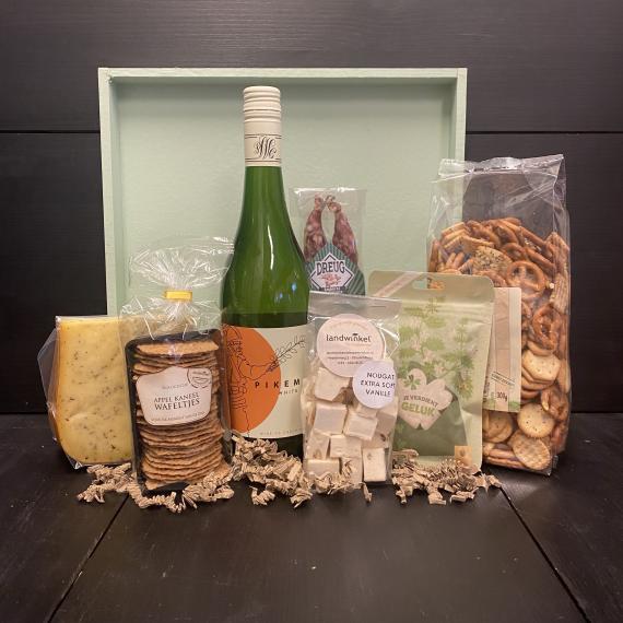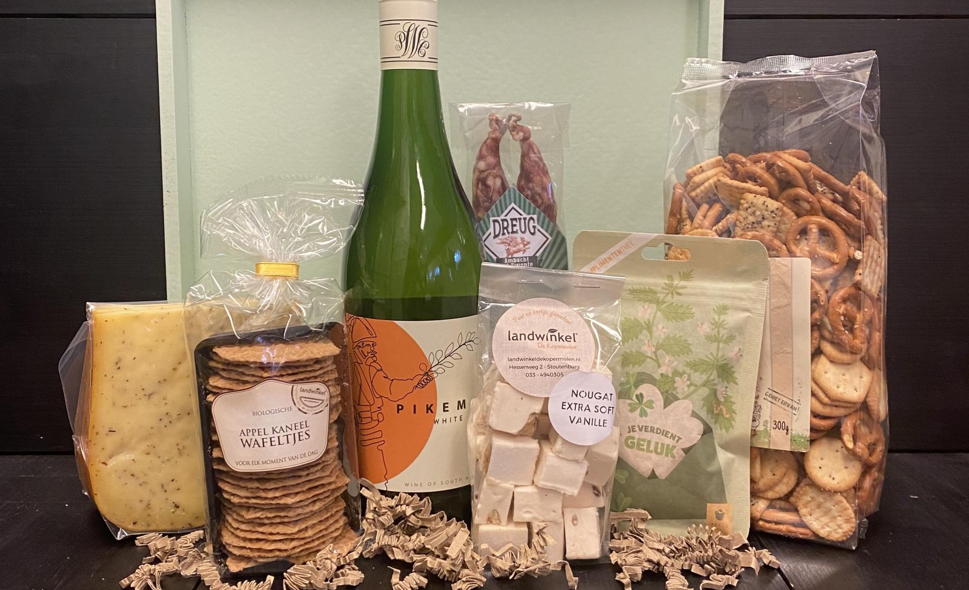 Op deze houten tray vind je alles voor een gezellige borrel of ga je voor een lekkere kop thee met een stukje nougat of een appel kaneel wafeltje?