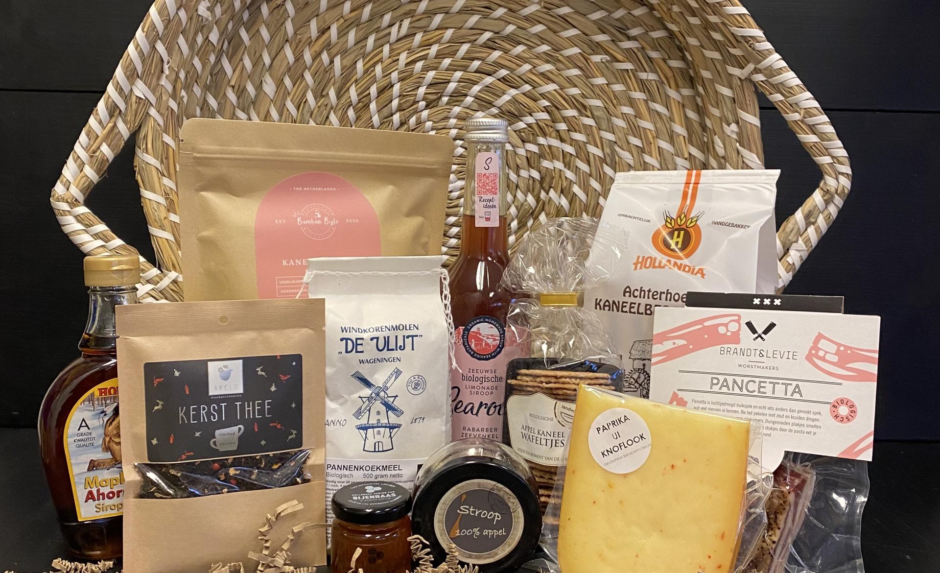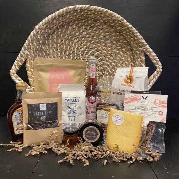 Deze mand is weer eens iets anders. Hierin zitten producten zoals Granola uit Amersfoort, Achterhoekse kaneelbeschuitjes, pannenkoekmeel met stroop, kerst thee en natuurlijk ook een stukje boerenkaas van onze eigen boerderij. Een originele mand om weg te geven en natuurlijk ook om te krijgen!