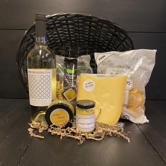 Deze mand is gevuld met lekkers voor de liefhebber voor iets hartigs. Heerlijk thuis genieten van een deze mooie wijn met een blokje boerenkaas met een kaasdipper en een borrelstokje met tapenade.